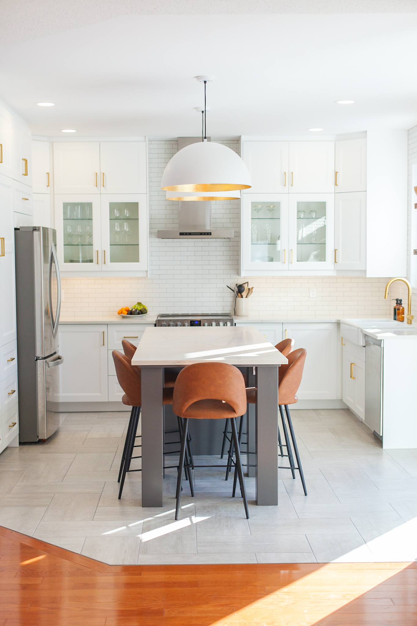 This kitchen transformation blends crisp modernlines with warm, welcoming details to create a space that feels both elevatedand effortlessly livable. Bright white cabinetry with brass hardware sets afresh, timeless foundation, while glass-front uppers add a touch of refineddisplay and help bounce natural light across the room.