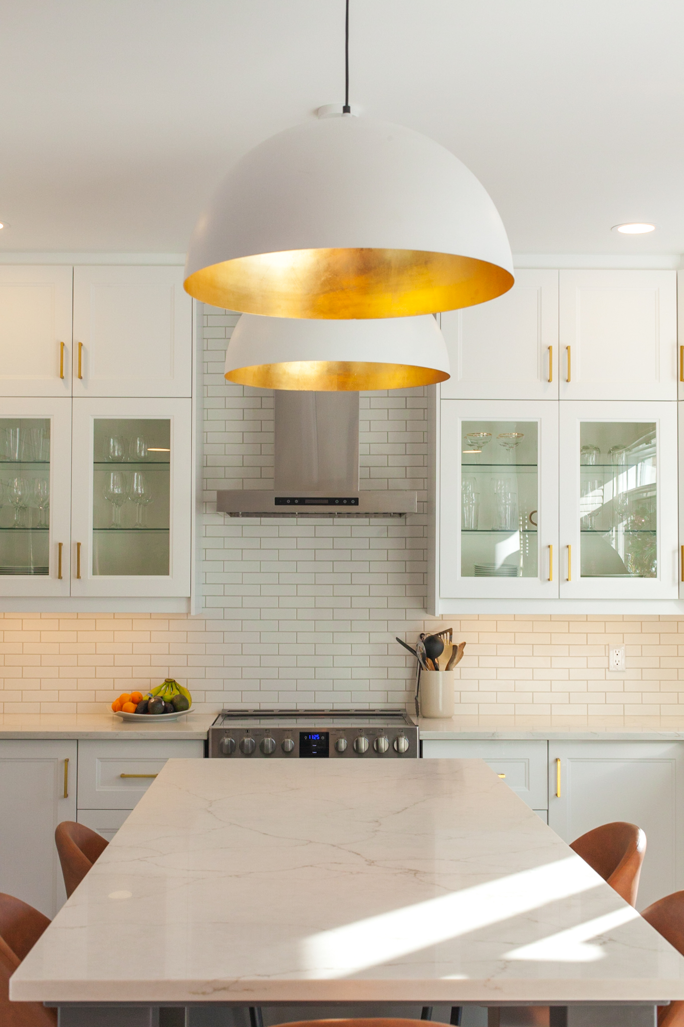A full-height subway tile backsplash bringstexture and classic character behind the stainless-steel range and hood,grounding the workspace with clean simplicity. The oversized dome pendants—withmatte white exteriors and warm gold interiors—become the sculptural focal pointof the room, casting a soft, ambient glow over the island.
