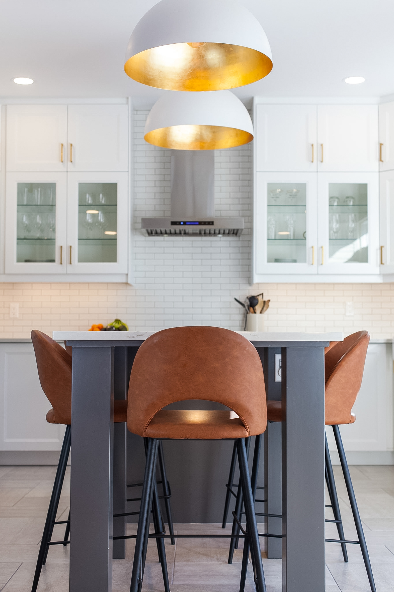 The island itself pairs a sleek marble-looksurface with a bold grey base, surrounded by caramel leather counter stoolsthat introduce warmth and tactility. Together, these elements tie the wholepalette together—white, brass, grey, and warm natural tones—creating balanceand flow.